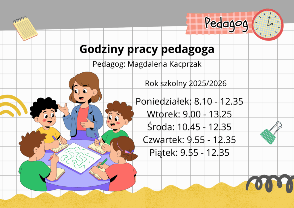 Nadrzędnym zadaniem pedagoga szkolnego jest udzielanie pomocy uczniom, znajdującym się w trudnej sytuacji szkolnej, rodzinnej, dbanie o właściwy rozwój dzieci i młodzieży i w tym celu podejmowanie działań wychowawczych, opiekuńczych, profilaktycznych, zaradczych.