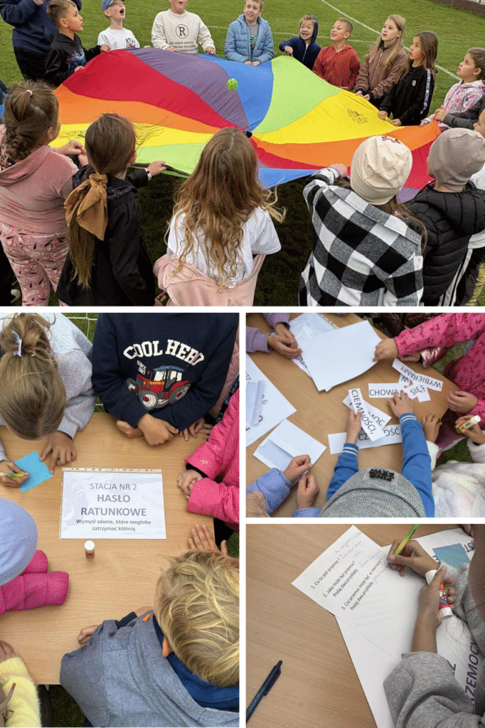 Tym razem nasi uczniowie wzięli udział w grze terenowej. Na kolejnych stacjach czekały na nich zadania wymagające współpracy, komunikacji i wzajemnego wsparcia. Energia i zaangażowanie były ogromne, a wspólne wyzwania pokazały, jak ważna jest współpraca i integracja w szkolnej społeczności.