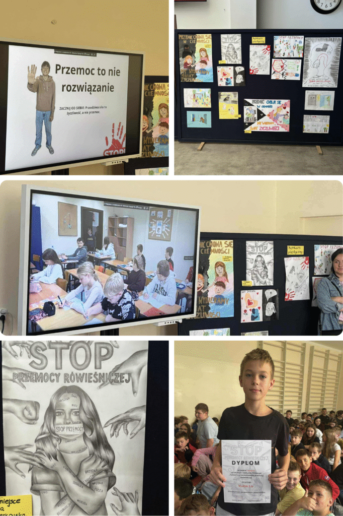 Na apelu podsumowującym tydzień przeciwdziałania przemocy rówieśniczej wręczono dyplomy uczniom klas 4–8, którzy wzięli udział w konkursach plastycznym i filmowym. Każda praca była wyjątkowa i pokazała, jak różnymi sposobami można mówić o ważnym temacie, jakim jest przeciwdziałanie przemocy.